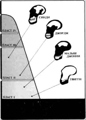 Но дальше с Homo habilis начинались трудности. Главная причина состояла в фрагментарном характере материала: от всех четырех найденных экземпляров мало что сохранилось. Как это часто бывает, каждому из них были даны имена. Первая находка — нижняя челюсть с двумя кусочками черепа — была названа «Малыш Джонни», потому что ее обнаружил сын Лики — Джонатан. Вторую находку, состоящую из нижней челюсти, зубов, обломков верхней челюсти и осколка черепа, назвали «Синди». Третья находка — «Джордж» — состояла всего лишь из зубов и очень мелких фрагментов черепа. Четвертая — «Твигги» — представляла собой сломанный череп и семь зубов. История «Джорджа» была крайне драматичной. Ископаемые остатки были обнаружены в конце дня, и деликатную работу по их извлечению из породы решили перенести на следующее утро. Однако ночью по ущелью прошло стадо коров, принадлежавших масаям. Они затоптали «Джорджа», совершенно расплющили и разбили его на кусочки — многие из них так и не были найдены. «Твигги», череп которой тоже был расплющен, но не скотом, а беспощадным давлением скалы, получила свое название по имени популярной плоскогрудой английской манекенщицы. «Синди» — сокращенное от Синдерелла (Золушка). И кажется, никто не знал, откуда взялось название «Джордж».