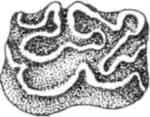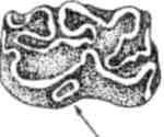 Эктостилид, который Джон Харрис пытался найти в хадарской коллекции лошадиных зубов, это небольшой округлый бугорок (показан стрелкой) на жевательной поверхности зуба. Hipparion, на зубах которого обычно имеется этот бугорок, вымирает позже 3 млн лет, на смену ему приходит окочо 2 млн лет назад истинная лошадь, Equus, на зубах которой нет эктостилида. Присутствие зубов Equus (возрастом не более 2 млн лет) в одном слое с ископаемыми остатками Homo в Кооби-Фора явилось одной из причин того, что Харрис и Тим Уайт усомнились в датировке черепа 1470 (якобы 2,9 млн лет). |