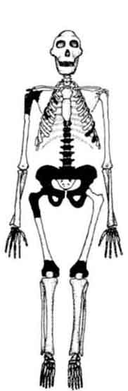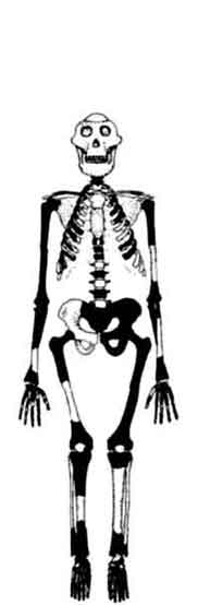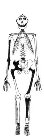 Если бы все найденные в Хадаре кости можно было соединить в одном скелете, то в нем были бы представлены части, закрашенные черным на левом рисунке. Аналогичные рисунки сделаны и для других австралопитеков. Сразу видно, что об Australopithecus afarensis, хотя он и открыт совсем недавно, известно гораздо больше, чем об Australopithecus africanus или robustus. Черепа всех трех австралопитеков тоже следовало бы зачернить, но этого не сделано, чтобы сохранить изображение деталей. Справа для сравнения представлен скелет современного человека. |