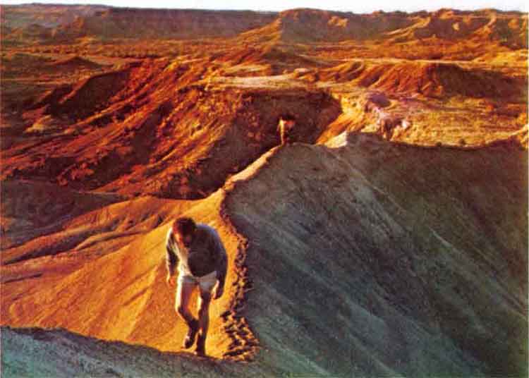 Датировкой и стратиграфией в Хадаре занимался Джеймс Аронсон (на переднем плане). Он часами бродил по отложениям в такой позе. Позади-его помощник Боб Уолтер, опытный вулканолог. |