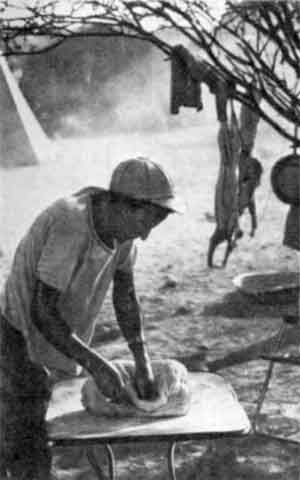 Кабете, экспедиционный повар, занимался приготовлением пищи на свежем воздухе, развесив тряпки, кастрюли, сковородки и даже съестные припасы на ближайшей акации. На снимке Кабете месит тесто, чтобы печь хлеб. Две козьи туши ждут своей очереди. |