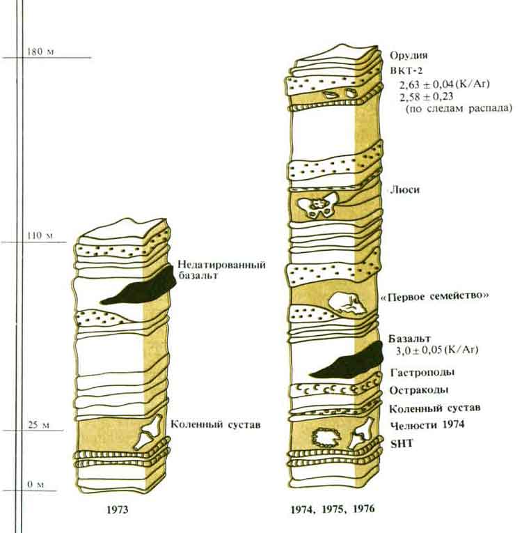 Тайебу посчастливилось найти слой базальта — окаменевший лавовый поток, а также менее мощные слои туфа (вулканического пепла), расположенные выше. Поскольку лава и пепел служат хорошим материалом для определения возраста, мы еще в предыдущий сезон собрали образцы пород и отправили их в Кливленд Аронсону для калий-аргоновой датировки. Пробы туфа из-за сильного выветривания Аронсон счел непригодными; однако базальт, хотя на нем тоже были следы разрушения, оказался вполне подходящим для анализа с помощью сконструированного Аронсоном прибора. Проведя несколько испытаний, Аронсон определил древность базальтового слоя в три миллиона лет с возможной ошибкой в 200 тысяч лет в ту или другую сторону.