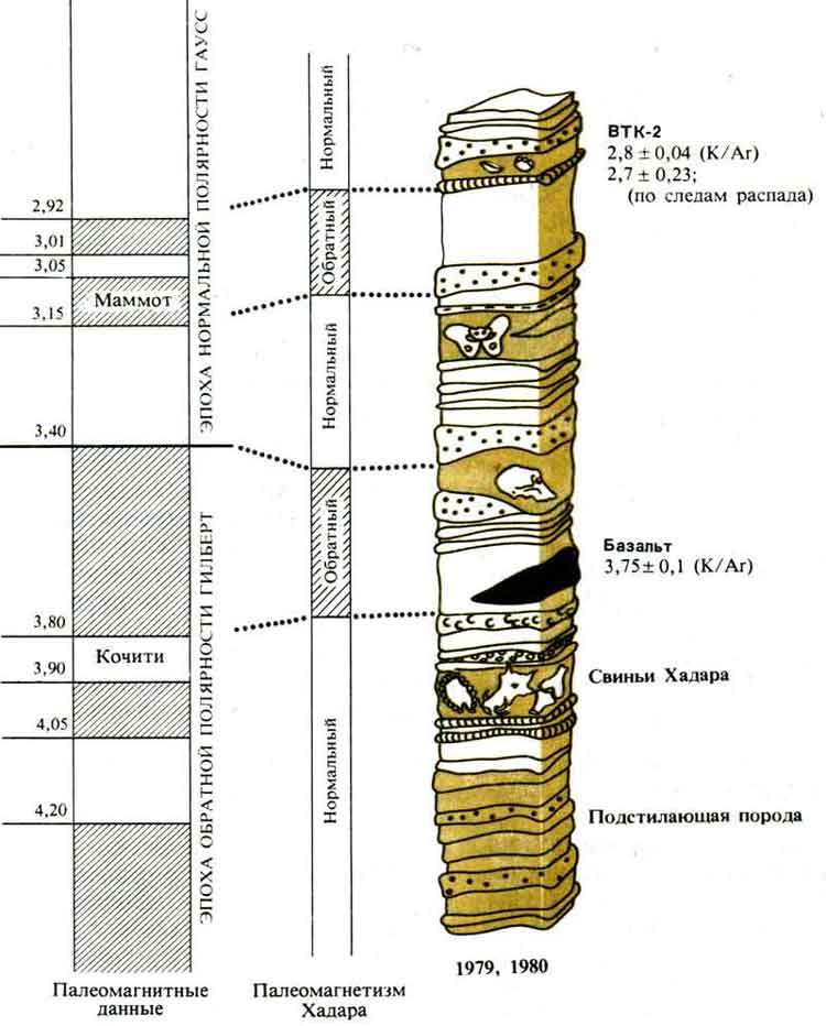Изучая расположение магнитных кристаллов внутри скальных пород, геологи смогли зафиксировать периоды аномалий, имевшие место на протяжении нескольких прошедших миллионов лет. Разумеется, ученые были не в состоянии определить точное время, когда происходили эти смены полюсов, а могли, лишь указать на их последовательность. В 1972 году, воспользовавшись хлынувшим из лабораторий потоком абсолютных датировок, основанных на изучении изотопов, трое специалистов независимо друг от друга пришли к сходным выводам относительно времени палеомагнитных изменений. Связав их с реальными геологическими событиями, они получили цифры, пригодные для всего мира, а значит, и для уточнения датировок Хадара. Для этого нужны были только образцы с магнитными кристаллами.