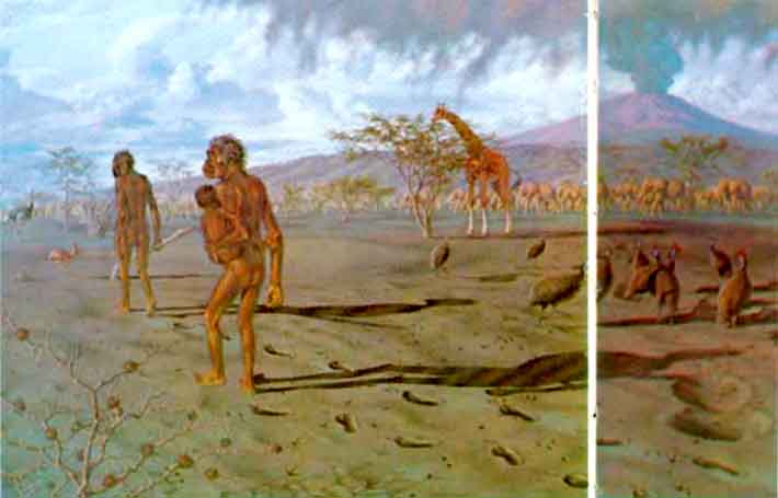 Невероятное стечение случайных обстоятельств привело к тому, что следы все-таки сохранились. Садиман выбросил пепел определенного типа, вслед за тем пошел дождь. Потом по слою влажного пепла прошлись гоминиды, и солнце быстро высушило отпечатки их ног. Вскоре произошло еще одно извержение Садимана, и следы покрылись новым слоем пепла, который защитил их от очередного ливня.