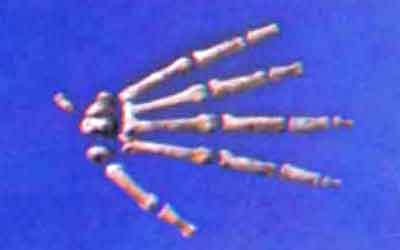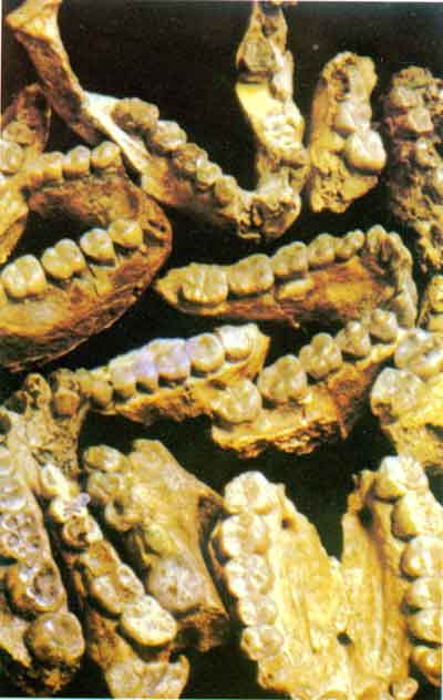 Небольшая часть удивительных находок Хадара. Среди челюстей выделяется своей V-образной формой челюсть Люси (вверху). В середине — челюсть, которую нашел на другой стороне реки мальчик-афар. Верхняя челюсть внизу справа — одна из находок Алемайеху. Отдельно изображена кисть, составленная из многих фрагментов с участка 333. |