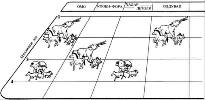 Эта схема показывает, почему череп 1470 не может быть датирован в 2,9 млн. лет. Биостратиграфические данные (сравнение ископаемых остатков животных из разных мест) говорят о том, что млекопитающие, жившие три миллиона лет назад — примитивная лошадь, древний слон и свинья, — были совершенно иными, чем те же животные два миллиона лет назад. Это относится ко всем местам находок, за исключением Кооби-Фора. Значит, можно думать, что датировка ископаемых остатков из Кооби-Фора ошибочна и должна быть пересмотрена в сторону уменьшения с трех до двух миллионов лет; а тогда требуется также передатировка черепа 1470. |