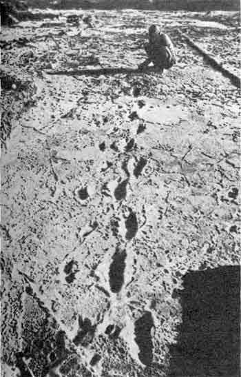 Главная забота Тима состояла в том, чтобы с найденными следами обращались с крайней осторожностью. Ведь отпечатки — необычайно хрупкая вещь. Достаточно малейшей оплошности при раскопках, чтобы полностью разрушить их, и некоторые следы уже были повреждены. Это не то что окаменелости, которые могут служить образцом прочности. Следы — это всего лишь углубления, вмятины в относительно податливой и хрупкой породе. Неловким толчком можно разрушить слой породы, и тогда след исчезнет навсегда.
