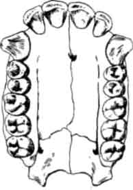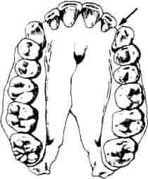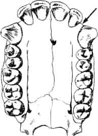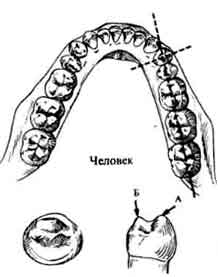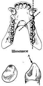 Диастема (показана стрелкой) есть не что иное, как пустое пространство в зубном ряду. Этот признак обязательно присутствует у человекообразных обезьян, так как при сомкнутых челюстях здесь помещаются огромные выступающие вверх нижние клыки. У человека клыки не выступают, поэтому необходимость в диастеме отпадает.