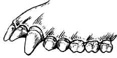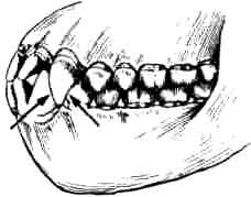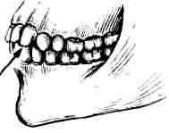 На ранних стадиях износа на передних и задних поверхностях коронки клыка заметны следы стертости, клыки сильно выступают за линию смыкания зубов. | Стирается только кончик клыка, даже на ранних стадиях износа клык не выступает за линию смыкания зубов. |