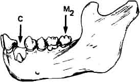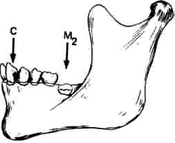 Клыки (С) прорезываются позже, после вторых моляров (Мд). | Клыки прорезываются рано, до вторых моляров. |