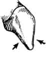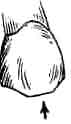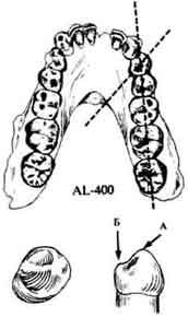 Нижний передний премоляр секториальной формы с большим протоконидом (А). Метаконид (Б) либо отсутствует, либо представлен только небольшим бугорком. Коронка располагается косо по отношению к оси зубного ряда. | Нижний передний премоляр двухбугорковый, несекториальной формы. Метаконид (Б) часто приближается по размерам к протокониду (А), причем оба бугорка лежат в поперечной плоскости. Передняя и задняя ямки хорошо выражены. |