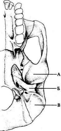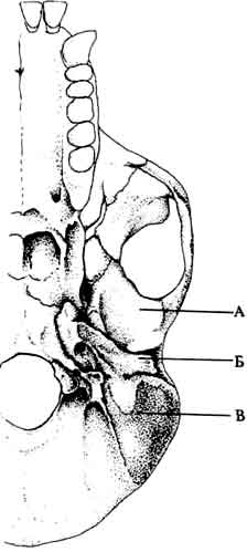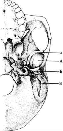 Буквой Б обозначена серповидная пластинка — небольшая трубкообразная кость, которая начинается у слухового отверстия и идет вглубь У человекообразных обезьян и особей из Хадара-Летоли она действительно напоминает трубку, а у человека больше похожа на гребень. Буквой В обозначен сосцевидный отросток У обезьян он плоский, треугольной формы У афарских австралопитеков — тоже треугольный, но его поверхность слегка выпуклая. У людей выпуклость увеличивается и на ней появляется складка. Весь отросток уже не треугольной, а овальной формы. |