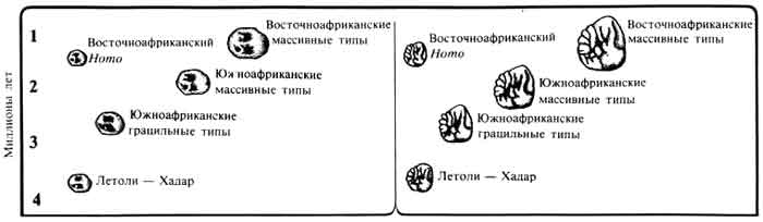 Так, видимо, и обстояло дело с интересующими нас особенностями зубов. В ряду Homo они не подвергались существенному давлению отбора и поэтому мало изменились. Изменение произошло не у Homo, а у австралопитеков. Эти гоминиды пошли своим путем и приспособились к образу жизни, несколько отличному от того, который вели древнейшие представители рода Homo. Именно эта специализация и привела к появлению у австралопитеков более крупных зубов.