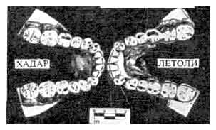 Если основываться на строении зубов и челюстей, то ископаемые популяции из Хадара и Летоли следует отнести к одному виду. Здесь изображены нижняя челюсть AL-400 (слева), которую нашел афарский мальчуган, и челюсть LH-4 (справа), лучшая в коллекции Летоли. Обе они, по существу, идентичны. |
