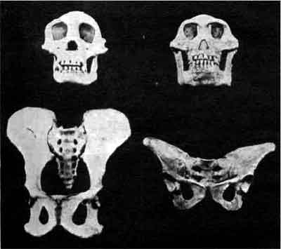 Сравнение черепа и таза шимпанзе (слева) и афарского австралопитека (справа) подтверждает, что последний похож на существо с телом человека и головой человекообразной обезьяны. У шимпанзе надбровные дуги сильно выступают, свод черепа низкий, мозг невелик, лицо прогнатное. У A. afarensis череп в основном такой же (хотя есть одно очень важное отличие — зубы человеческого типа). Однако ниже шеи скелеты разительно несходны: у шимпанзе таз четвероногой обезьяны, у A. afarensis — почти как у современного человека. |