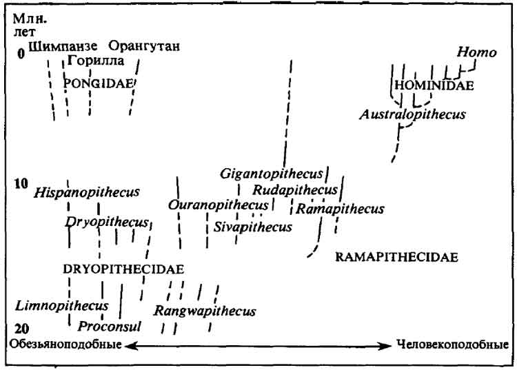 Так просто и в то же время так сложно. Двадцать лет исследований и перетасовок привели к созданию обманчиво простой схемы. Существенно в ней то, как Пилбим расположил различные типы, распределив их по горизонтали в соответствии со степенью близости к человекообразным обезьянам или к гоминидам. Так, существо, названное Limnopithecus, заняло в его схеме крайнее левое положение, так как это наиболее обезьяноподобная из всех миоценовых форм, a Ramapithecus благодаря наибольшему сходству с гоминидами оказался на правом краю — он явно претендует на роль нашего предка.