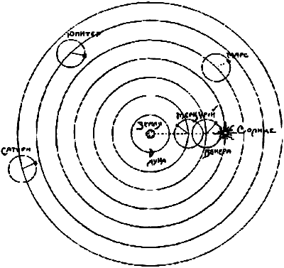 Что же касается до того, понимал ли он истинную причину затмений Солнца, как факта закрытия его Луной, то это очень сомнительно. Его собственное описание показывает, что он просто признавал эти явления за особенные знамения бога, подчиняющаяся определенной законности. Дело в том, что древних наблюдателей совершенно сбивали с толку лунные затмения. Пока Земля не считалась такой же планетой, как и все другие, пока ее представляли, как Иоанн, четырехугольным дном мировой коробочки, прикрытой стеклянным колпаком, по которому ходят небесные светила,—лунные затмения не могли быть ничем объяснены, а это бросало тень таинственности и на соответствующие им солнечные затмения. Правда, что в половине второго века уже появилась книга Птолемея, представлявшая Землю шарообразной и пытавшаяся объяснить небесные явления обращением вокруг Земли Солнца и Луны по циклам, т.е. кругам (рис. 64), а остальных планет по циклам (называемым в астрономии деферентами) и эпициклам, т.е. надкругам, "как будто бы колесо находилось в колесе" (Иезекииль, 1). Но эта система, благодаря выделению Земли в центр вселенной, являлась настолько запутанной, что могла возбуждать недоверие у людей, считавших, как Иоанн, Библию за непосредственное откровение самого бога.