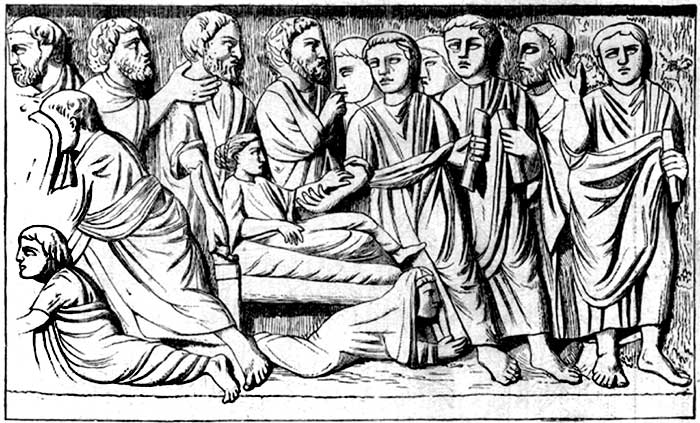 ![]() Рис. 47. Легенда об евангельском "учителе", как о маге. Его преображение перед усыпленными Петром, Иаковым и Иоанном внизу. Направо стоит Илия, а налево Моисей (без бороды). Из рукописи творений Григория Назиаизиса (№ 512 Парижской Национальной Библиотеки) ![]() Рис. 48. "Девица, встань!" Пробуждение евангельским учителем сомнамбулы (внушением) по евангельскому сказанию. С барельефа мраморного саркофага Арльского музея. Относится (хотя и без особых оснований) к VI веку. Иисус здесь со свитком в руке |