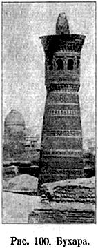 Никакой архитектор, конечно, не воспроизводил этого при своих постройках вследствие уродливости такой деформации. Значит, и в приведенном проф. Николаевым примере она сама возникла за 95 лет существования теперешнего Музея Академии Наук. Но для нас она особенно поучительна. Из фотографии видно, что изгиб произошел без образования расхождений между отдельными гранитными камнями, — значит, путем хронической деформации самих камней от их давления друг на друга. Отсюда ясно, что деформироваться как одно целое могут не одни монолитные сооружения, вроде цельных мраморных или гранитных колонн, а и сцементированные из отдельных камней, хотя бы например из кирпичей, путем той же хронической деформации последних. Как пример этого проф. Николаев приводит один из минаретов Бухары, обнаруживающий признаки такого же бочкообразного расширения по средине, как и колонны старинных зданий (рис. 100, стр. 136). Он думает, что она сначала имела форму усеченного конуса.