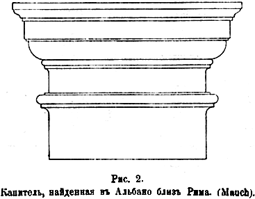 А вдавливанье постороннего тела в какой-либо предмет без образования в нем трещин тоже должно производить его деформацию, и потому между колонной и карнизом устраивается обыкновенно рюмкообразная капитель (такова, например, капитель, описанная Manch’ом в Альбано близ Рима) (рис. 2, стр. 23).