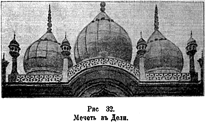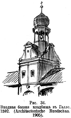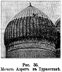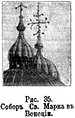 С этой точки зрения чрезвычайно интересно, что деформационная луковицеобразная прикрышка храмов (вместо правильных куполов, естественно изображавших небесный свод) существует в самых отдаленных друг от друга странах совершенно разной культуры. Так проф. Николаев приводит Успенский собор в Москве (рис. 31 стр. 46), Мечеть в Дэли в Индии (рис. 32), мечеть Азреил в Туркестане (рис. 36), Собор Св. Марка в Венеции (рис. 35) и входную Башню кладбища в Галле (рис. 34).