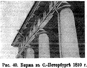 И интересно, что в древних колоннах в той части их капители, где она сходится с самой колонною, постоянно находят 3–4 обручеобразные выемки, которые объясняются тем, что это «шейка» опоясывалась бронзовыми обручами, вероятно для предотвращения ее растрескивания. В настоящее время все такие обручи давно разворованы, но в одном или двух случаях они остались. Пользы в них было конечно мало, так как расширение колонны произвело бы растяжение и металлического кольца и едва ли предупредило бы растрескивание. Как наглядный пример деформации капителей проф. Николаев приводит здание Ленинградской Биржи, построенной в 1810 году и переданной теперь под Музей Академии Наук.