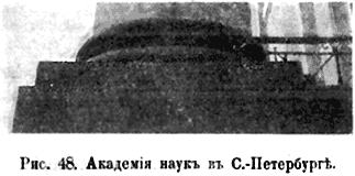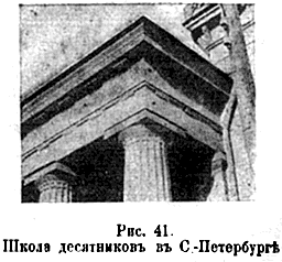 От 1810 до 1905 г., когда вышла его книга «Физические начала архитектурных форм», прошло почти столетие, и автор не без основания указывает, что капители колонн этого здания (рис. 40, стр. 57) слишком плоски для того, чтобы допустить, что они были такими и первоначально. Точно также признаки развороченья капителей нашел он и в двух зданиях около Московской заставы, в одном из которых помещалась в 1905 году «Школа Десятников» (рис. 41, стр. 58). А как пример разворачиванья базисов у колонн автор приводит гранитную базу портика Академии Наук (рис. 48, стр. 61), где случайно, благодаря неравномерной осадке находящихся под нею камней плита базы у колонны оказалась явно вдавленной.