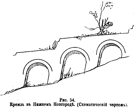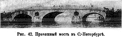 Как хороший пример такого рода искривлений автор приводит три арки Кремля в Нижнем Новгороде, построенных на косогоре и сильно искривившиеся без нарушения связности кирпичей, благодаря сползанию под ним почвы (рис. 54, стр. 64). Не менее интересен и Прачечный Мост, как он был в Петербурге 1905 года, где первоначальная дугообразная кривизна благодаря оседанию средины моста перешла на оба конца, сделав средину почти плоской, а края (благодаря расширению хорды, происшедшему от выпрямления дуги) более крутыми, чем были (рис. 42, стр. 58). Такие же явления проф. Николаев заметил и в других старинных каменных мостах. В большинстве их нет никаких разрывов между отдельными камнями, но бывают случаи и противного, и как пример их он приводит трещину в Арке Церкви Иоанна Предтечи в Ярославле (рис. 56 стр. 66, где пунктиром показано состояние ее до деформации, а сплошными линиями современное состояние).
