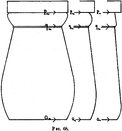 Соединяя этот вывод с предшествовавшим, мы можем определить де-формационную фигуру колонны, имеющей в одно и то же время и собственный вес, и одновременно с этим подвергающуюся давлению находящегося над нею карниза. Очевидно, что пояс ее наибольшего утолщения будет тем ниже, чем меньше отношение давления ее карниза к ее собственному весу, и что в случае не скользкого основания наибольшая толщина колонны тут никогда не опустится до степени усеченного конуса.