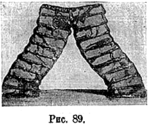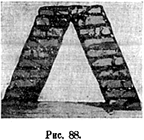 Во всех этих случаях не только не образуется промежуточных щелей между отдельными камнями, но наоборот уничтожаются все первичные щели, оказавшиеся между ними благодаря неточности первоначального прилаживания. При общей деформации постройки камни ее соответственно самоскашиваются, переходя, например, из прямоугольников в косоугольники. Из правильных усеченных треугольников в арках они переходят в косые усеченные треугольники, а в колоннах отдельные камни должны сплющиваться (рис. 30 стр. 45). Если их утолщение по средине колонны произошло от деформации, то оно должно сопровождаться соответственным уменьшением вертикального размера ее кирпичей сравнительно с не расширившимися частями, а если этого нет, то, значит, утолщение сделано искусственно из подражания деформировавшимся таким образом старинным колоннам.