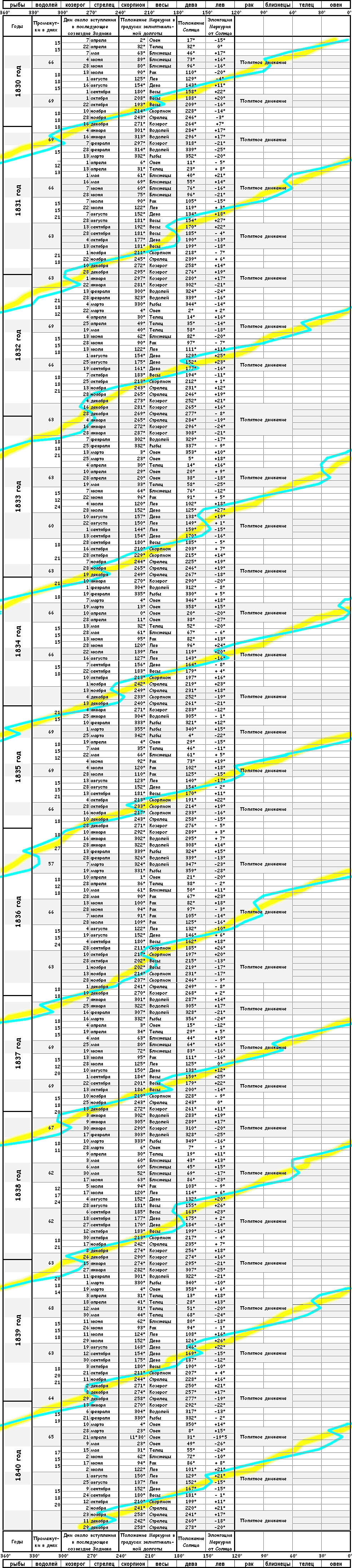Еще лучше 6-летний цикл Меркурия в среднем без 1 дня, но и его можно применять только к положениям Меркурия при его прямом движении, т. е. около верхнего соединения с Солнцем.