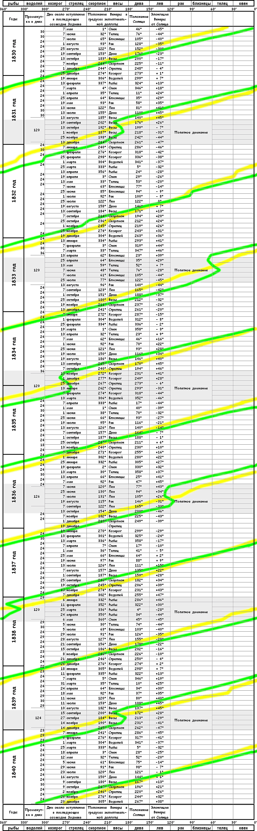 В .................................. вычислены не в точности 30-градусные промежутки, а лишь близкие к ним, чтоб не усложнять последовательности вычисления, но и здесь мы видим из последних двух колонок, что разность сложений в градусах почти в точности равна разности в днях, а так как Солнце проходит почти по 1° в день, то 3-летний цикл Венеры тут оправдался в полной точности.