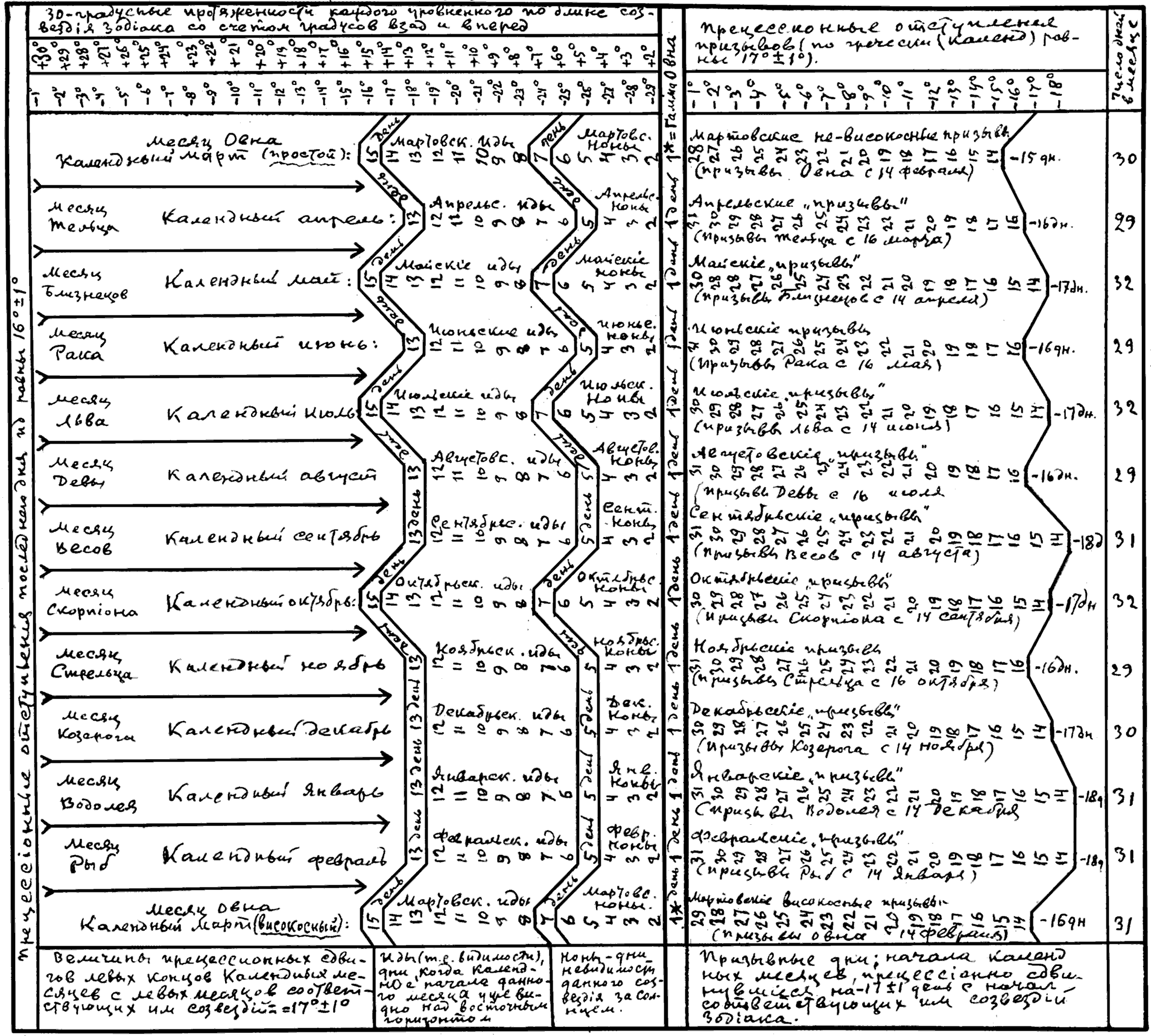 Для человека, имеющего ясное представление о соотношениях "звездного" и "климатического"9 года, сразу ясно, календная (т. е. призывная) часть календных месяцев, как она дана на моей общей таблице (табл. ... ) представляет собою "призывы" климатическими месяцами своих удаляющихся от них созвездий, а неодинаковые числа призывов, зависят от неодинаковой длины юлианских месяцев, в то время как их созвездия все считались равномерными в 30°.