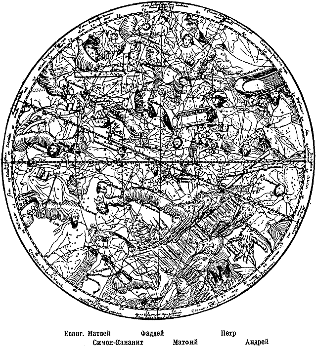 Считая евангелие Луки написанным уже в IX веке нашей эры Лукой Элладским, мы можем придти к заключению, что в эпоху Возрождения астральное происхождение чуть не половины апостолов Иисуса было совсем забыто, хотя идея о их «мистическом» соотношении с двенадцатью знаками Зодиака и продолжала существовать и возобновляться при каждом сравнении тайной вечери Христа с астрологическими картами неба. Наглядное доказательство Этого мы в видим в замечательной книге, которую показывал мне раз Камилл Фламмарион в своей библиотеке в Париже в 1908 году. Это великолепно раскрашенный фолиант астронома-католика Жюля Шиллера 1661 года, вчетверо уменьшенный и обесцвеченный снимок с которого я и привожу из Astronomie populare Фламмариоиа (рис. 121, 122). Вот как реставрировано там заново только-что приведенное мною перечисление Матвея (табл. ).