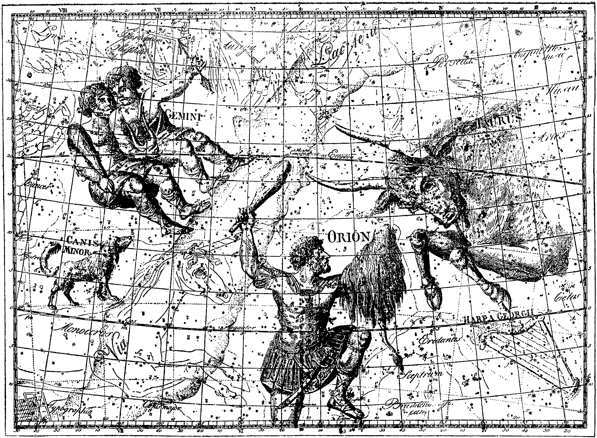 ![]() Рис. 152. Созвездие Ориона-Быкоборца (по-еврейски АРИАН — арианин), как первоисточник изображений Митры. Налево — Близнецы со стрелой метеоритов-геминид, и за ними клешни Рака. |