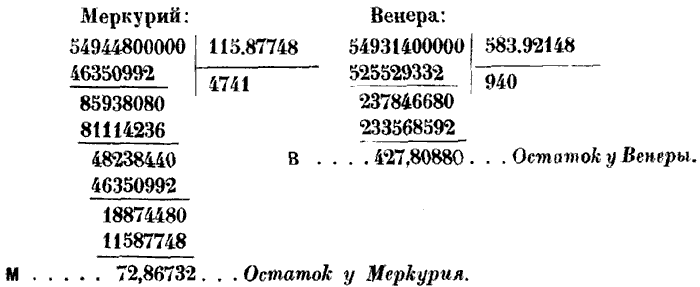 К этим разностям прибавляем по пяти нулей по числу дробных десятичных знаков в оборотах Меркурия и Венеры (см. табл. XV в V отделе) и делим на эти обороты до тех пор пока в частном не придется переходить к десятичной дроби, пользуясь для скорости отделом V таблицы XV, где времена синодического обращения обеих планет уже перемножены на все единичные числа. Имеем: