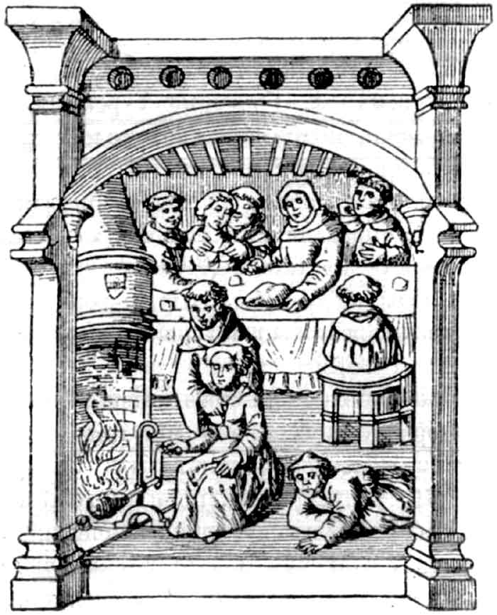 ![]() Рис. 113. Ужин средневековых монастерионцев. Миниатюра в Библии XIV века (Парижская национальная библиотека). |
