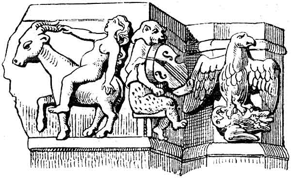 ![]() Рис. 115. Изображения на капители кафедрального собора в Магдебурге. Голая женщина на козле, обезьяна играет на гитаре и орел уносит сову (Otto: Manuel do I'Archéologie de l'art religieux an moyen âge. 1884). |