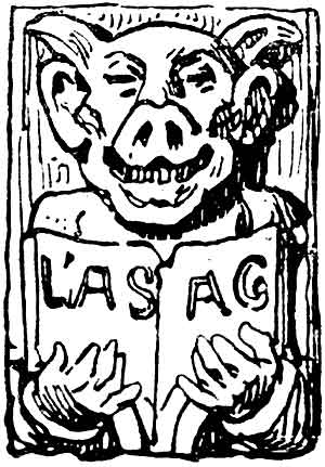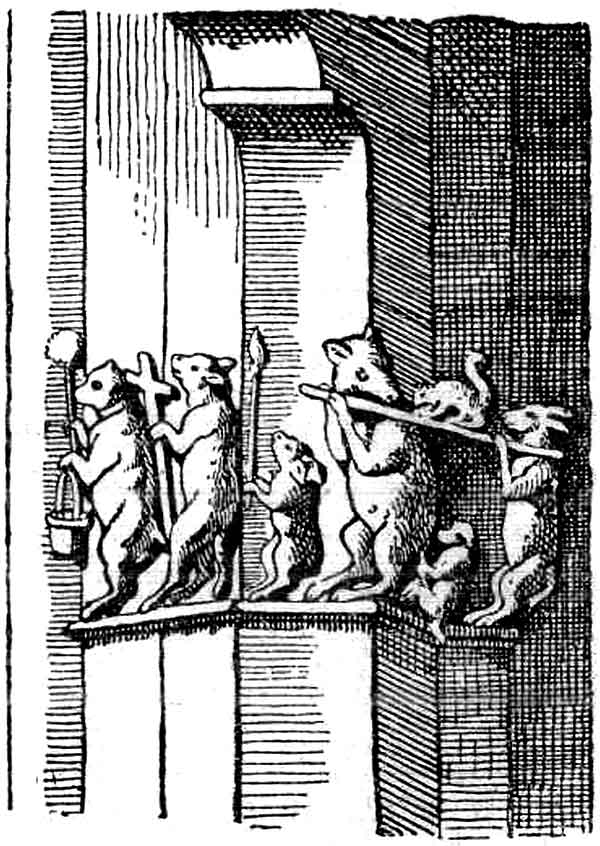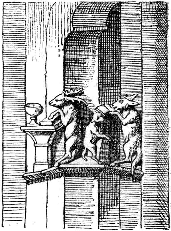 ![]() Рис. 116. Изображения на капители Страсбургского кафедрального собора XVII века. Медведь несет кропильницу со святой водой, за ним с крестом волк, за ним заяц с факелом, а сзади свиньи и козел несут носилки с лисицей и внизу обезьяна держит свинью за хвост. | ![]() Рис. 117. Другая капитель Страсбургского кафедрального собора XVII в. Козел стоит перед причастной чашей, и осел читает Евангелие над головой обезьяны. |
