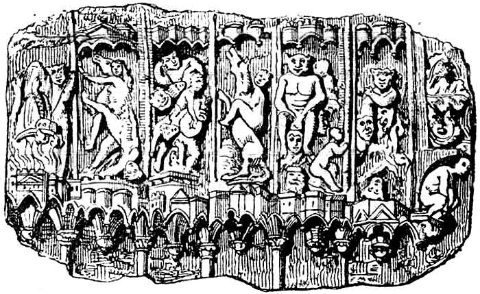 ![]() Рис. 114. Скульптура в подземной зале кафедрального собора в Бурже. По рисунку Бальи (Bailly) реставрировавшего его. |