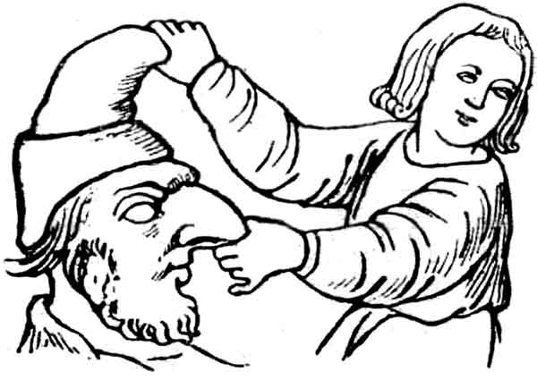 ![]() Рис. 119. Молодая жена натягивает нос своему мужу. Старинная скульптура на портале церкви Ploёrmel (по Champfleury). |