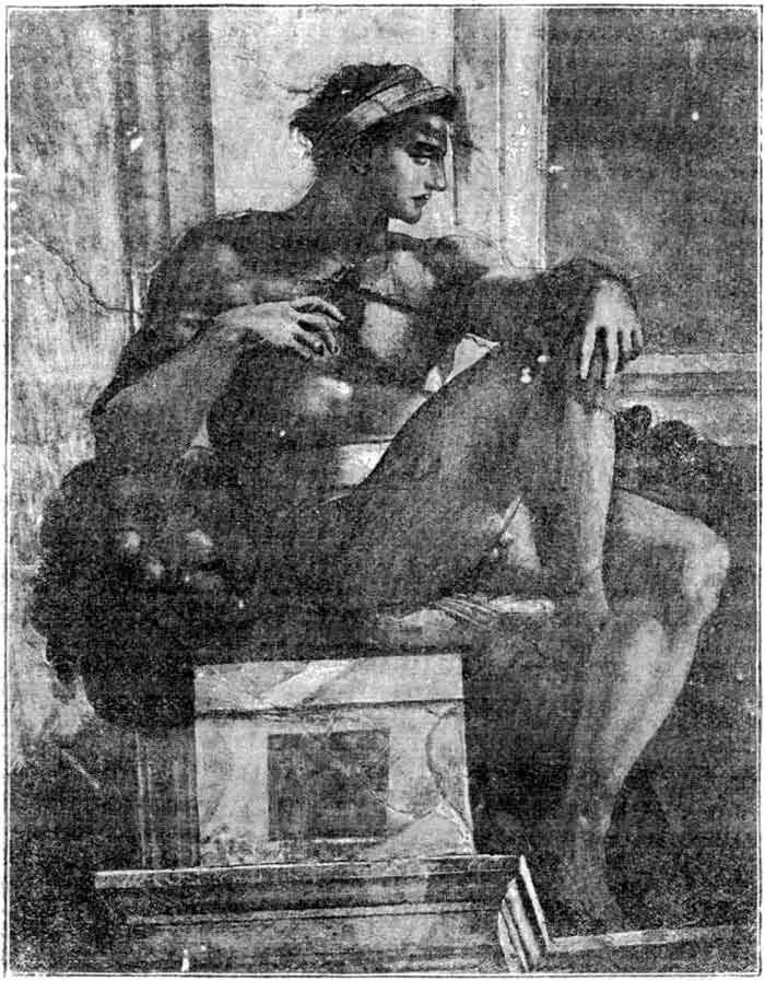 ![]() Рис. 120. Классицизм в старинном католицизме. Фигура нагого юноши, работы Микель Анджелло (ум. в 1564 г.) на стене Сикстинской капеллы в Ватикане. |