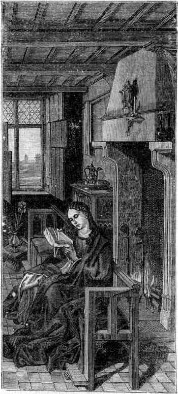 ![]() Рис. 121. Историческое сновидение. Ван Эйк Van Eyck), отец жанра пейзажа в живописи (1370—1426). Первое художе-ственное изображение девы Марии. Она представлена в виде молодой женщины, читающей книжку в обстановке XIV века. (Мадрид, Музой Прадо). |