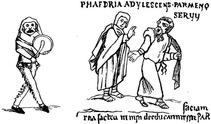 Рис. 122. Единство актерских костюмов и приемов у классиков и у западно-европейских народов. Налево изображен средневековый актер (из книги Roman de Fauvel, XIV века), а направо два классических актера (в Терентии во рукописи, относимой к IX веку). |