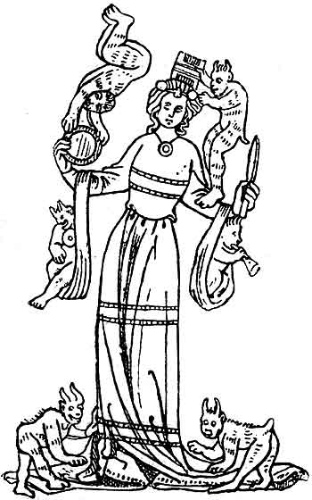 ![]() | (Слева) Рис. 123. Гномики-чертики одевают и причесывают молодую девушку (Из манускрипта XIV века, по Champfleury).