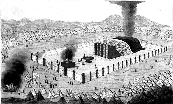 «В первый день первого месяца второго года соорудил Моисей скинию, ее Фундамент, брусья, шесты и столбы, и распростер над ними покров. Он внес в нее ковчег завета со «свидетельством)), прикрыл его крышкой, завесил открывающейся завесой, и на завесе с севера поставил в скинии стол собрания и положил на нем ряд просфор, а против стола к югу поставил светильник и зажег лампаду. Перед завесою он поставил жертвенник, па котором курился Фимиам, соорудил двор вокруг скинии и жертвенника и повесил покров над входом» (Исх. 46, 17—33).
