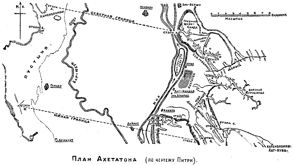 В середине выстроенного Хун-Атеном нового столичного города (рис. 176) стоял — говорит сказание — великий храм Солнца. Город будто бы лежал невдалеке от Нила на большой равнине, напоминающей равнину западной части «Фив».