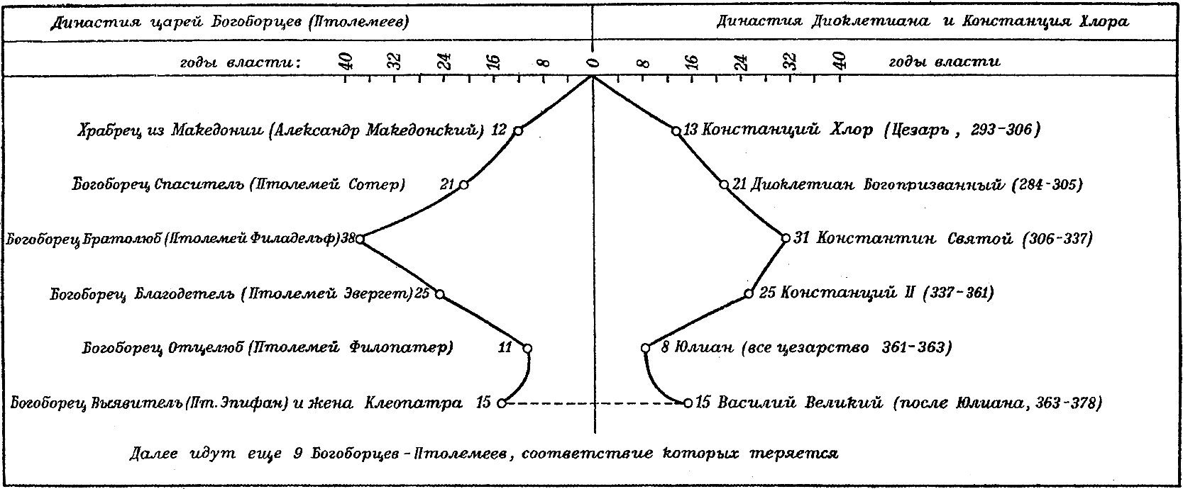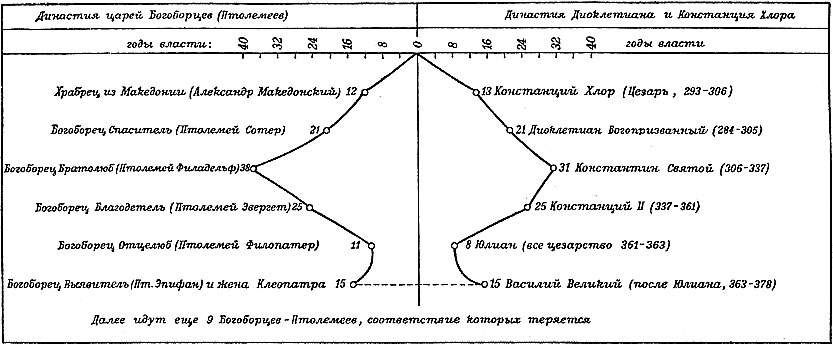 «При нем — говорят нам — создается значительный флот галер, Александрия делается городом всемирным и в ней начинает сосредоточиваться ученость всего мира», как было и при Диоклетиане, и при Юлии Цезаре. Второй-Богоборец Братолюб (Птолемей II Филадельф), преемник Богоборца-Спасителя, был, как и Константин Великий, сначала соправителем, а потом и единовластником. При нем александрийский флот увеличился и, кроме того, как мы только-что видели, была заложена гавань Вереники, т. е. Кораблепобедная для морских сношений с Аравией и далее по Индийскому океану, вплоть до Индии. Александрийская библиотека загремела по всему читающему миру (который, впрочем, едва ли достигал нескольких сот человек). Он пытается — говорят нам — провести даже канал через Суэцский перешеек и строит много храмов, в чем принимает участие и жена его Арсиноя (т. е. Мужественная). Время царствования дают ему, правда, несколько более продолжительное, чем его отражению в IV веке нашей эры, Константину — 38 лет вместо 31 (считая и соправительство), — но такие неточности вполне в пределах вариаций у разных авторов. Его преемник, третий Богоборец-Благодетель (Птолемей III Эвергет), царствует, как и преемник Константина Великого, Констанций II, около 25 лет, и оба ведут упорные войны с персами, причем царь-Благодетель вывозит из Азии в Египет «несметные богатства» и массу сокровищ. И он покровительствует — кому бы вы думали ? — евреям, т. е. по-нашему арианам! И в честь его жены было названо Кононом Александрийским, этим созигеном Юлия Цезаря, созвездие Волоса Вереники. А так как имя Вереника значит Кораблепобедная гавань, то выходит, что простая гавань к тому времени не только превратилась в женщину, но и вырастила себе роскошные волосы. А что касается до царей, то при переложении лет их царствования на диаграмму, мы опять получаем совпадение с византийскими царями, мало похожее на случайное по теории вероятностей (рис. 224).