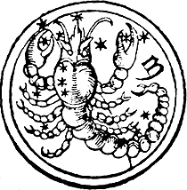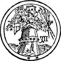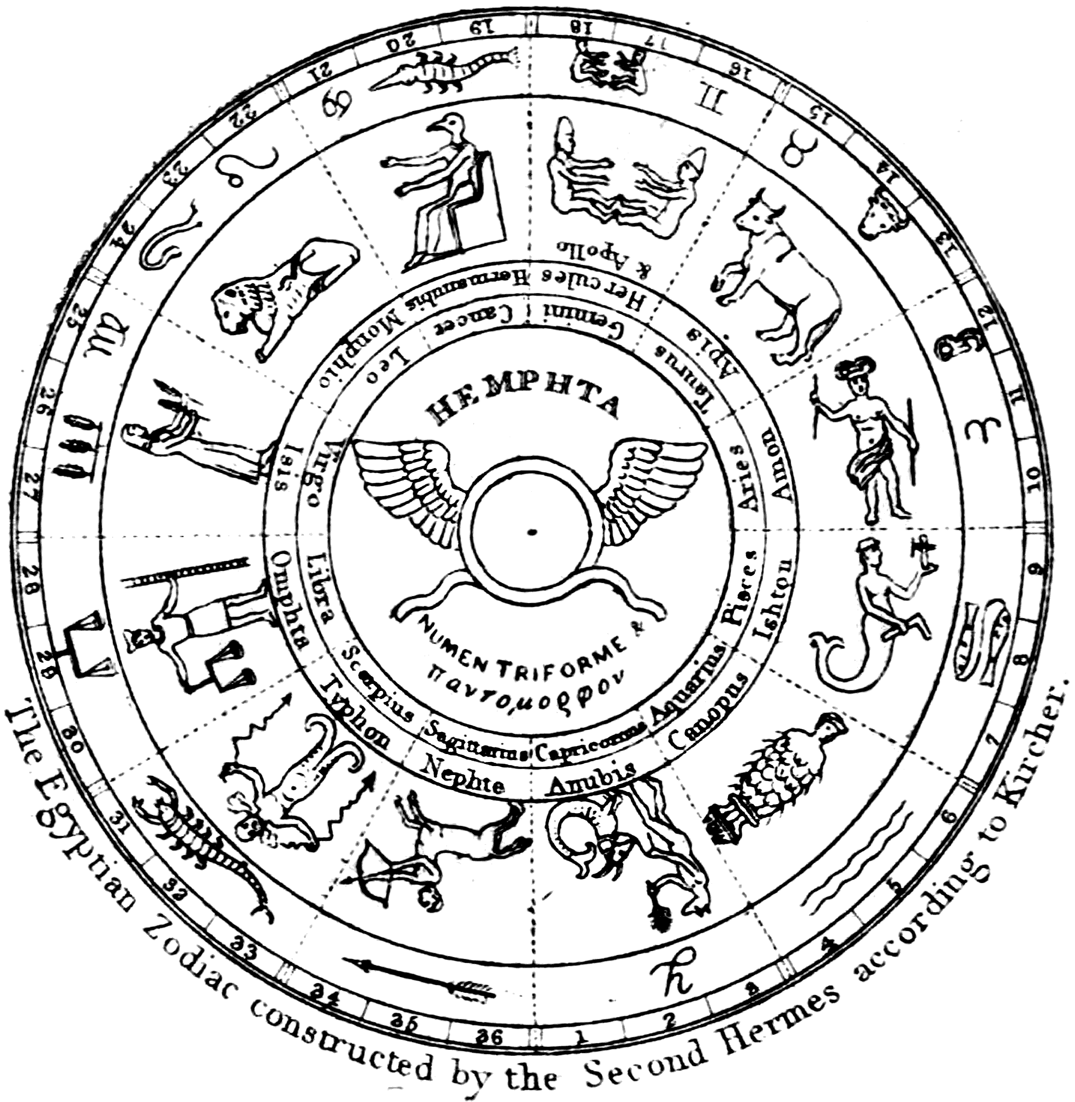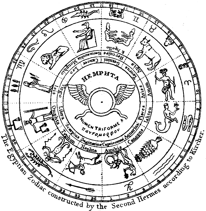 Рис. 39—50. Двенадцать созвездий древнего Зодиака, чертоги, или храмы планет: Овен, Телец, Близнецы, Рак, Лев, Дева, Весы, Скорпион, Стрелец, Козерог, Водолей, Рыбы. Из Астрономии Бахараха (Bacharach: Astronomia). Редчайшее издание. 1545 г. Книгохранилище Пулковской обсерватории.  Рис. 51. Двенадцать чертогов для планет. Египетский Зодиак, приписываемый Гермию II, по Кирхеру. |
