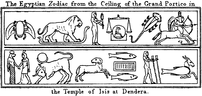 ![]() Рис. 74. Египетский Зодиак храма Изиды в Дендерах. |